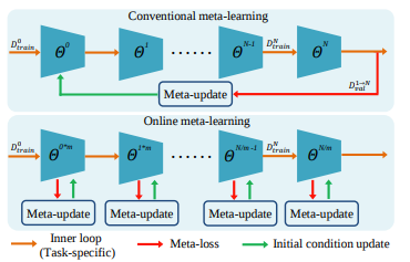 즉 on-the-fly-meta-update 방식을 사용하는데, 이것은 다음 그림처럼 간헐적으로inner-loop, outer-loop를 최적화 한다.