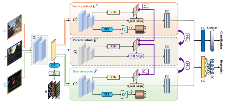 target domain으로 추출된 feature은 M개의 source subnet과 psuedo subent으로 들어가게 된다.
