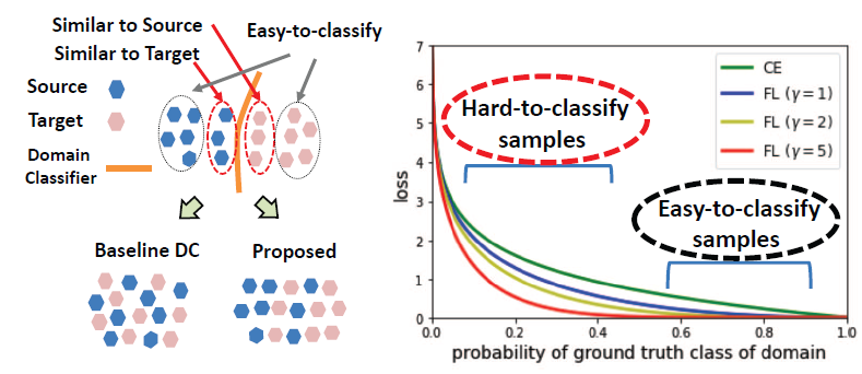 저자는 domain classifier가 쉽게 분류되는 examples을 무시하고 분류하기 어려운 examples에만 집중하기를 원했다.